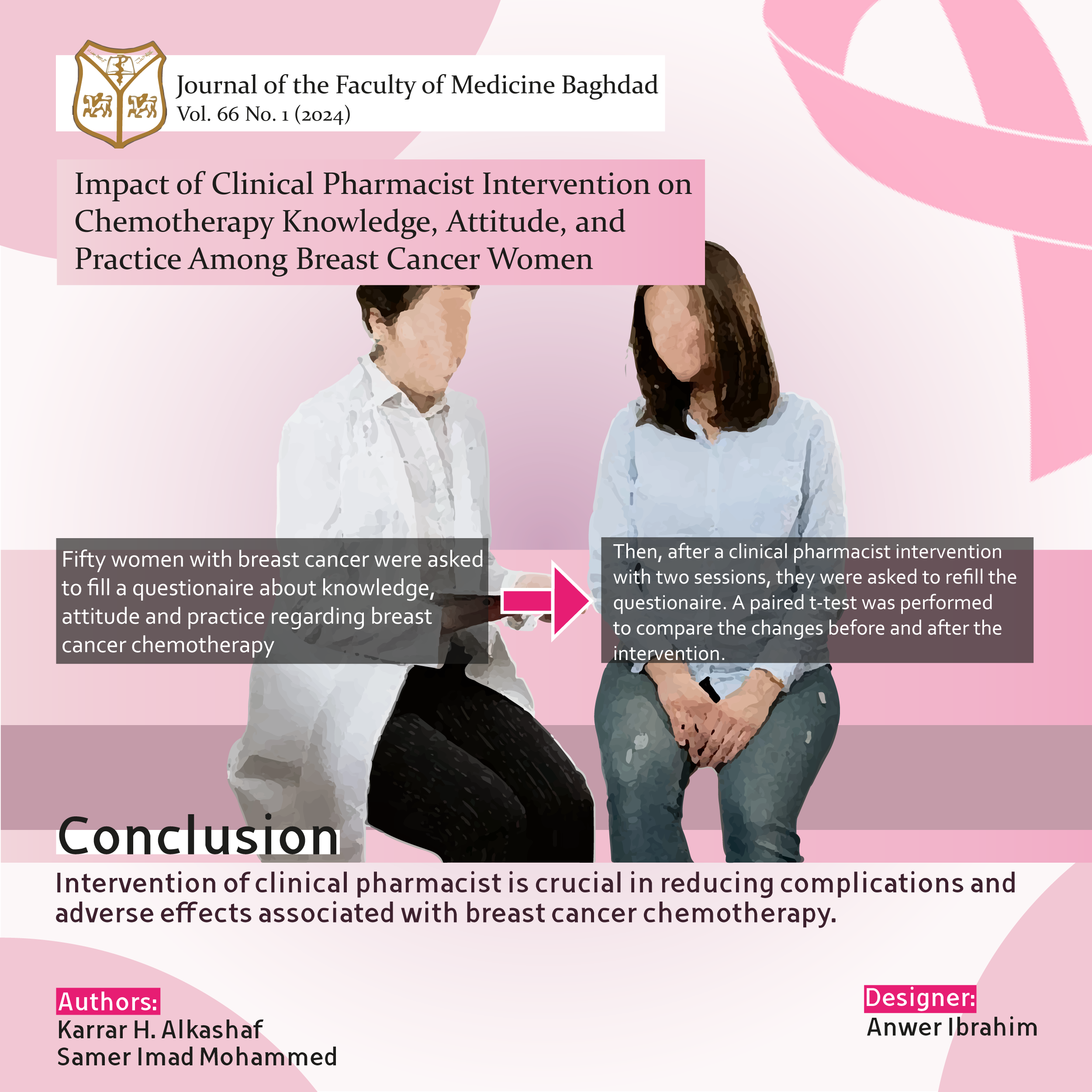 Patients and methods: A pre-post clinical pharmacist interventional study was conducted at the chemotherapy ward of AlHabbobi Hospital in AlNasiriyah City, located in the south of Iraq. The study involved fifty women with breast cancer who were provided with comprehensive pharmaceutical care and a self-compiled medication knowledge guide pamphlet. Two sessions were conducted for each patient; the first was conducted after the patient filled out a questionnaire at baseline and the second was conducted after 21 days, depending on the chemotherapy schedule. Each session lasted for approximately 45 minutes. Participants were requested to fill out the questionnaire at the end of the study. Within the group, a paired t-test was used to compare the changes before and after the invention.