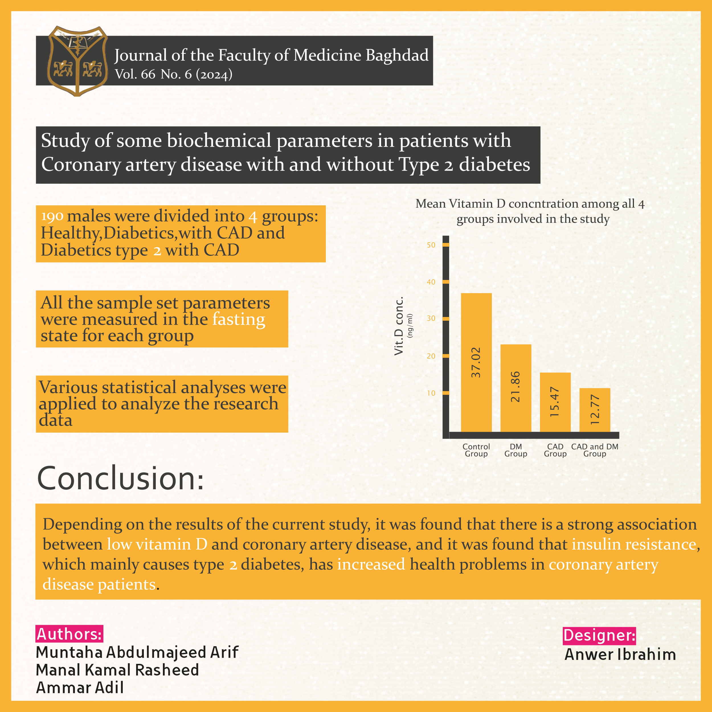 Methods: A case-control study included 190 male subjects divided into four groups: 40 healthy controls, 40 diabetic patients, 55 patients with coronary artery disease, and 55 patients with Type 2 diabetes and coronary artery disease. Were recruited from the catheterization unit in cardiologic clinics of the Iraqi Center for Heart Disease and Specialized Center for Endocrinology and Diabetes, Baghdad Teaching Hospital/ Medical City, during the period from February 2022 to November 2022. Physicians diagnosed them and were evaluated by physical and full medical history. Each group measured all the sample set parameters in the fasting state. The biochemical tests included fasting blood glucose, and lipid profile measured by the colorimetric method, while vitamin D3, insulin, and glycated haemoglobin (HbA1c) were measured by enzyme-linked immunosorbent assay (ELISA). Various statistical analyses were applied to analyse the research data. The statistical analysis was performed using a Student t-test for calculating the probability using the statistical analysis program (PAST version 3.09, 2004). Two-way ANOVA and least significant differences (LSD) post hoc tests were performed, and paired t-tests were done. P < 0.05 was considered statistically significant.