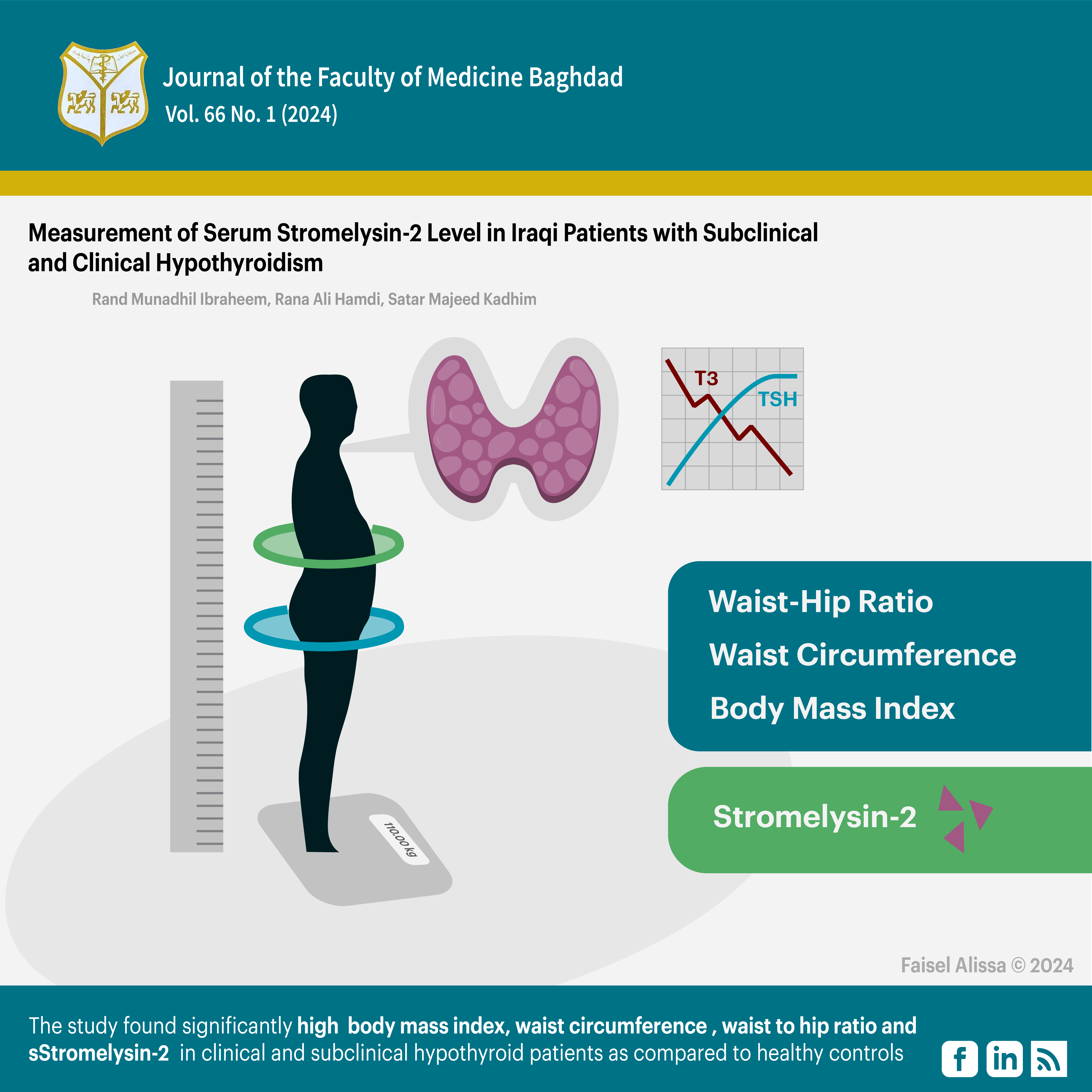 Result: The study found that clinical and subclinical hypothyroid patients had significant higher mean body mass index (P = 0.001), waist circumference (P = 0.001), waist to hip ratio (P = 0.001), and serum stromelysin-2 (P = 0.001) compared to healthy control. Among patients with clinical hypothyroidism group, there were positive correlations between serum stromelysin-2 and body mass index (r = 0.413, p = 0.005), waist circumference (r = 0.406, p = 0.006), and waist to hip ratio (r = 0.367, p = 0.013).
