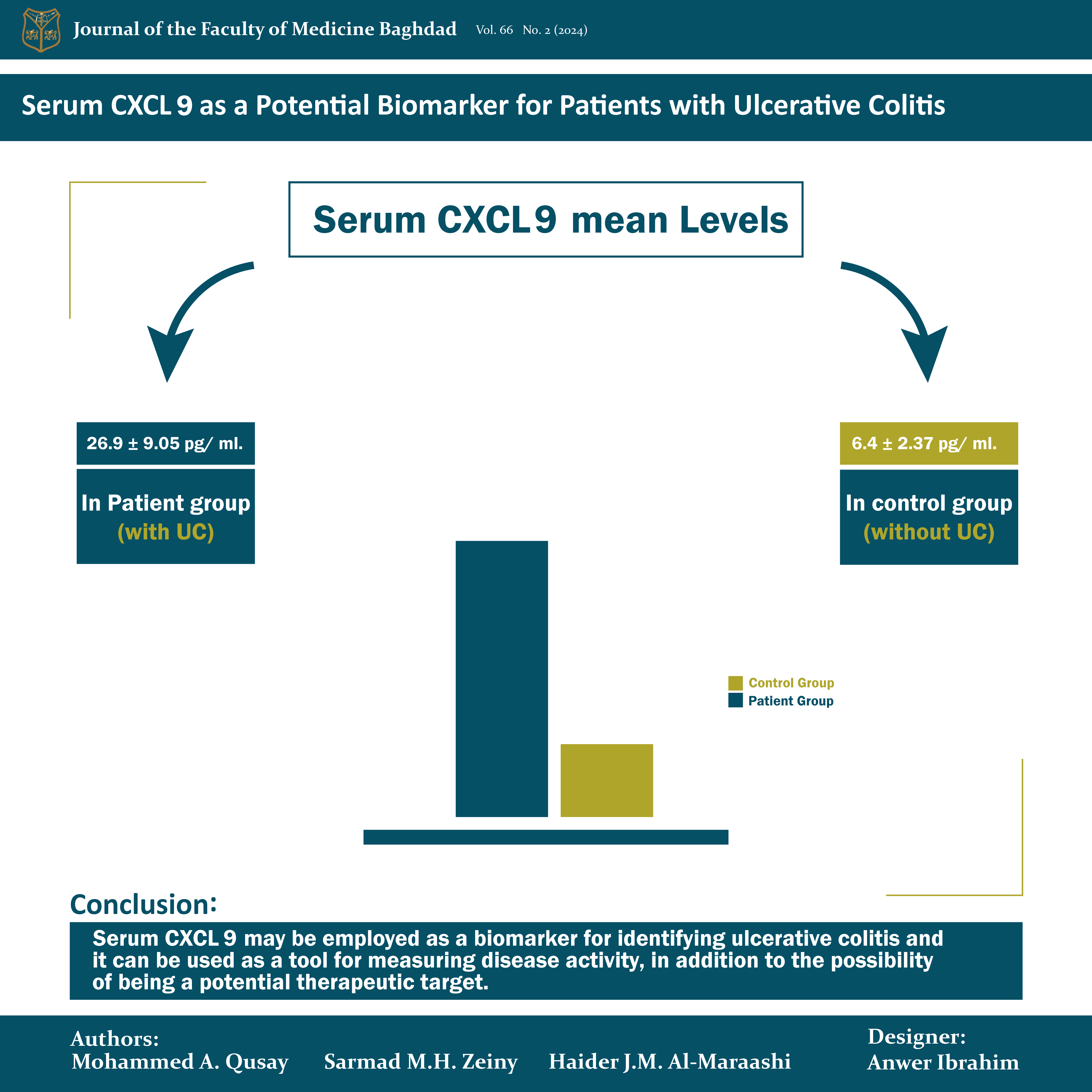Results: The mean ± SD in pg/ml of serum CXCL9 in the patient group was 26.9 ± 9.05 and in the control group was 6.4 ± 2.37 (p< 0.0001) which indicates a highly significant difference.
